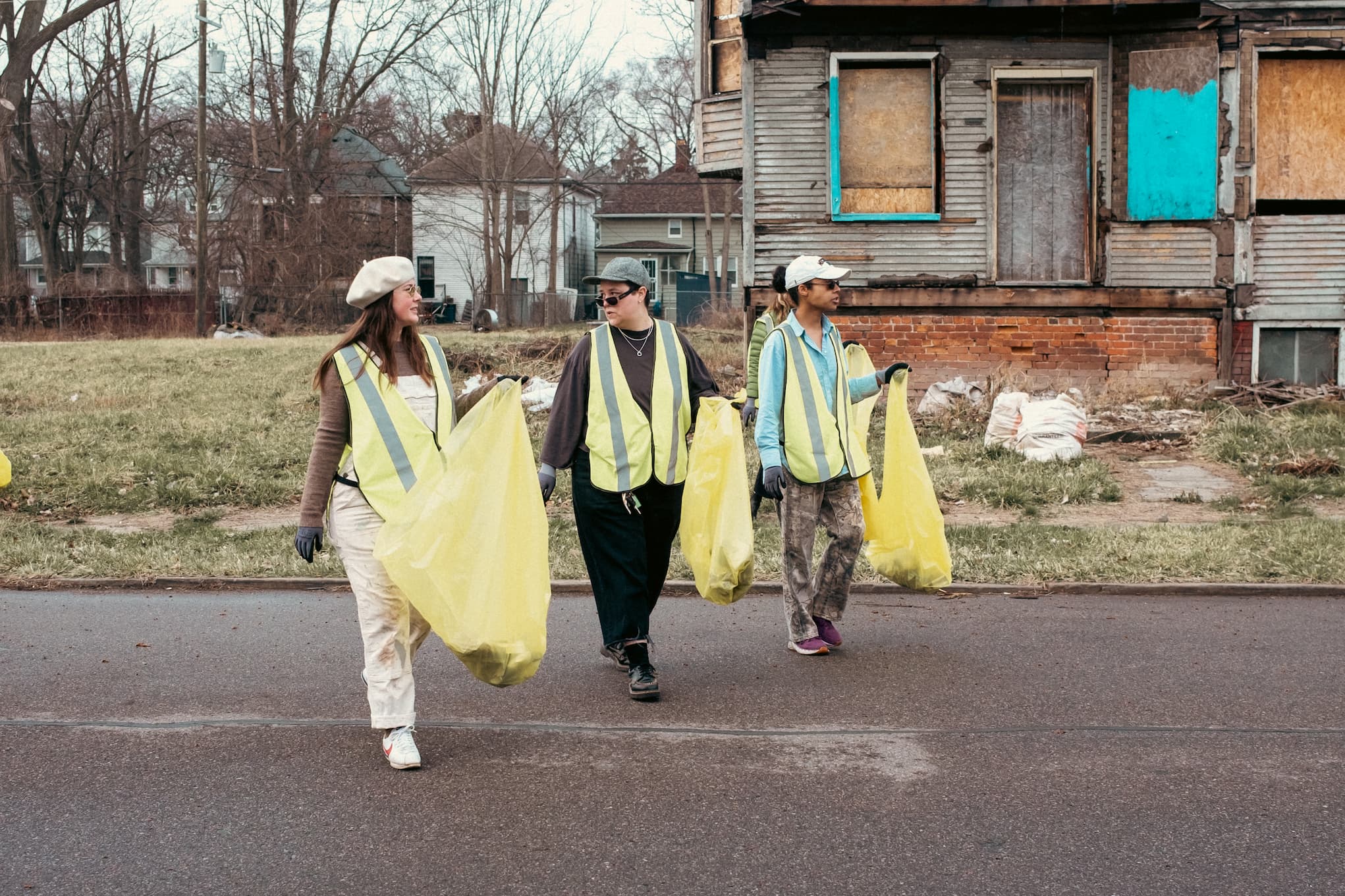 In our day-long collaboration, we cleared debris and disposed of over 32 bags of trash around our neighborhood. Weaving between bustling residential streets and empty, overgrown lots on the east side of Detroit, we felt a rhythm of attention emerge. It drew us into a thicket of local stories and histories, and into a deeper sense of our own agency within them.