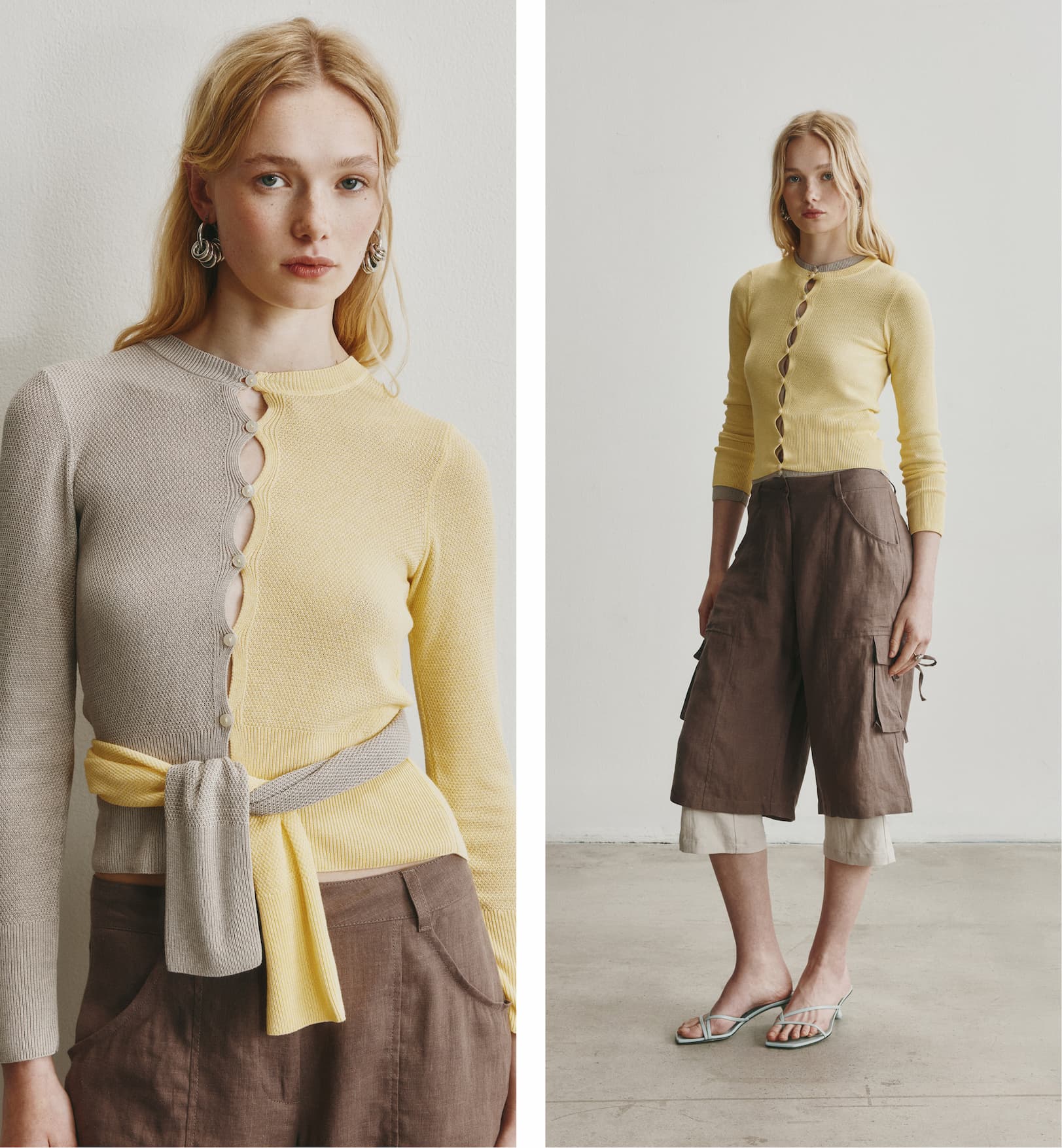 Charlotte wears the Kenza Kissing Cardigan, the Sila Linen Tie Short in Bark (coming soon), and the Linen Capri (coming soon)